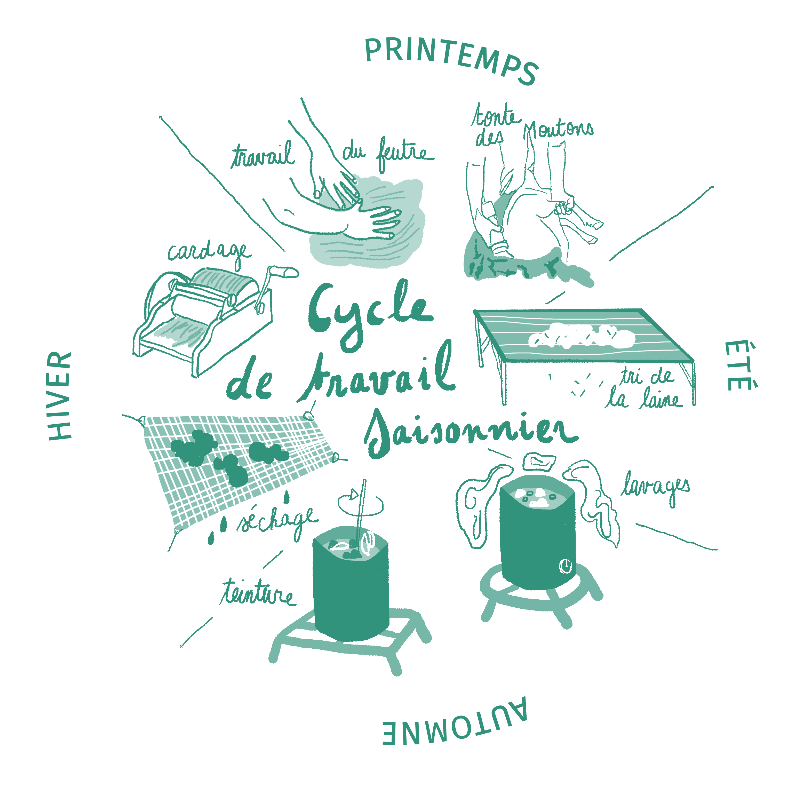 Nous nous rendons sur les chantiers de tonte pour trier la laine au rythme du travail de tonte, puis cette dernière est acheminée à l’atelier du Studio Bercail, où elle sera lavée, cardée et éventuellement teintée puis feutrée.
