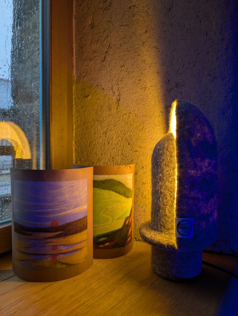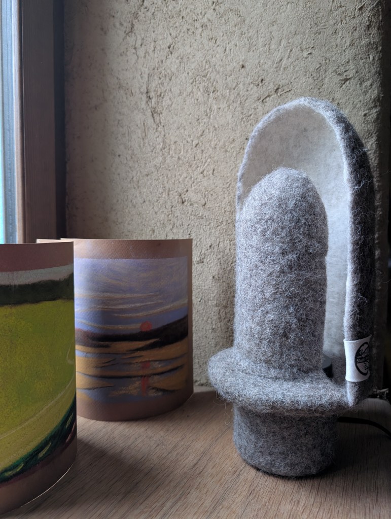Une fois la laine lavée, cardée et teintée, elle est prête à l’emploi pour être feutrée. Le feutrage est la dernière étape de fabrication de nos objets. Ce travail physique consiste à frictionner très amplement la fibre textile animale au savon ou à l’aiguille tout en modelant une forme à l’aide de techniques diverses (usages de moules, de guides sur mesure…). Plusieurs heures suffisent à modeler un objet de taille moyenne comme un de nos luminaire..