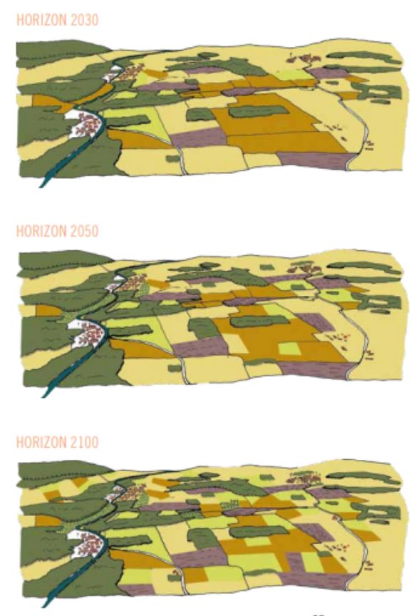 Dans ces projets, les notions d’usage des sols, de respect de l’environnement, d’organisation de filières côtoient la thématique du paysage et méritent d’être interrogées dans leur dimension spatiale. Ces études peuvent mener à l’élaboration de scénarios prospectifs imagés sur le devenir des espaces agricoles d’un territoire.
